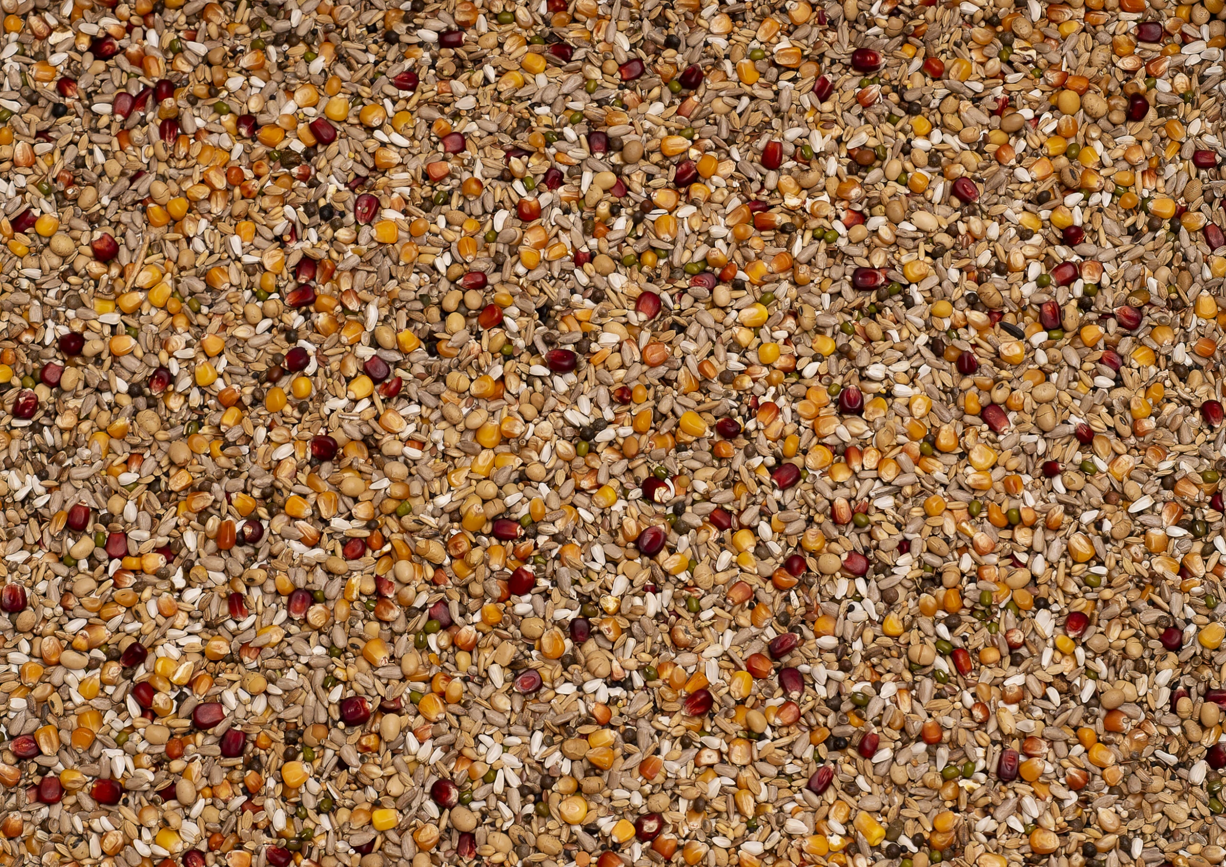 Geschälter Sonnenblumenkerne 10%, getoastete soja 6%, Bordeaux mais 5%, Maïs merano 5%, Hanf 5%, geschälter Hafer 5%, weiβe Weizen 5%, Mais Cribbs 5%, kleiner Cribbs-mais 5%, Kardi 5%, Paddy-Reis 5%, Mais Popcorn 5%, Wicken 4%, Leinsamen 4%, Weiβe samen 4%, Plata Mais 4%, Naturreis 4%, Kadjang Idjoe 3%, Raps 2%, Rübsen 2%, Mariendistel 2%, Millet gelb 2%, Sesam 2%, Millet Weiβ 1%